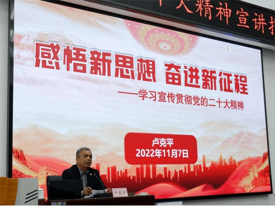 卢克平从党的二十大报告精神,党的二十大报告新表述、新概括、新论断,党的二十大报告中的科教兴国战略三个方面提纲挈领、点面结合进行了精彩的报告。卢克平指出,党的二十大报告中的新表述、新概括、新论断给我们党、国家和人民指出了今后的努力方向,既阐明了世界观又提供了方法论,坚持好、运用好贯穿其中的立场、观点、方法,为实现中华民族伟大复兴提供了理论上和实践上的明确指引,继续扎实推进实践基础上的理论创新和理论指导下的伟大实践。