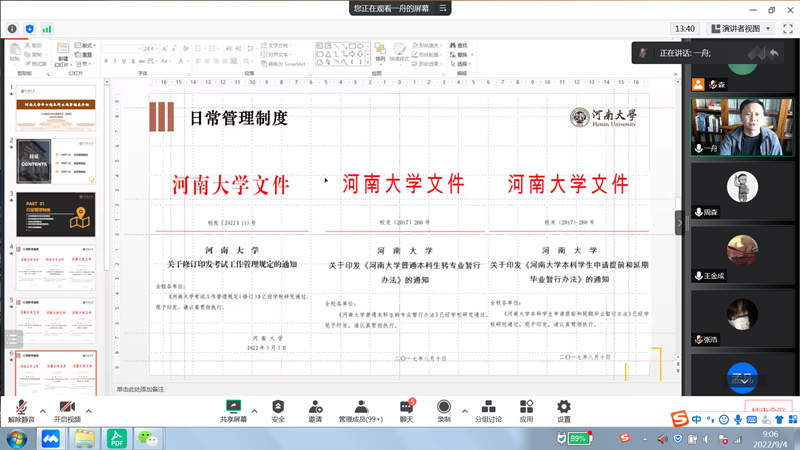 9月4日上午是“规章制度专题”,学院党委副书记赵艳忠按照“日常管理类制度”“奖励类制度”“处罚类制度”,带领同学们重点学习了《华体会注册全日制普通本科学生管理规定》《华体会注册全日制普通本科学生学籍管理规定》《华体会注册全日制普通本科学生考勤与请销假管理办法》《华体会注册全日制普通本科学生奖励办法》《华体会注册全日制普通本科学生国家奖助学金管理办法》《华体会注册全日制普通本科学生违纪处分办法》等规章制度,并要求同学们在入学教育期间,自主学习其他规章制度。他希望同学们遵规守纪,坚守底线,不触红线,奋发有为,不负青春韶华。
