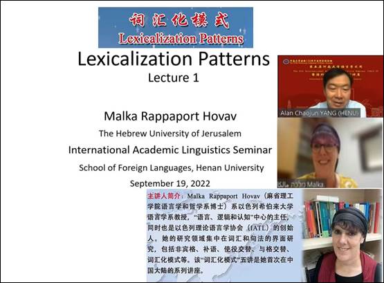 华体会注册第五届语言学术周暨“海外高端专家系列讲座”(100~109)在众多师生的期待下于9月19日成功拉开序幕,本活动将持续5天时间,每天两场高端讲座。为拓展广大师生的国际视野,营造良好的学术氛围,外语学院特邀请以色列希伯来大学语言学系教授Malka Rappaport Hovav和英国剑桥大学理论级应用语言学系教授Ian Roberts做系列讲座,他们的主题分别为“词汇化模式(Lexicalization Patterns)”和“普通语言学理论(General Linguistic Theories)”。此次系列讲座分别在Zoom平台和腾讯会议平台进行,有来自国内外知名高校480多位师生广泛关注并热情参与。讲座伊始,外语学院院长杨朝军教授致欢迎辞,并简要介绍了两位教授的教育经历、研究领域及学术成就,同时对他能在百忙之中抽时间为学院师生作线上报告表达了诚挚的感谢。