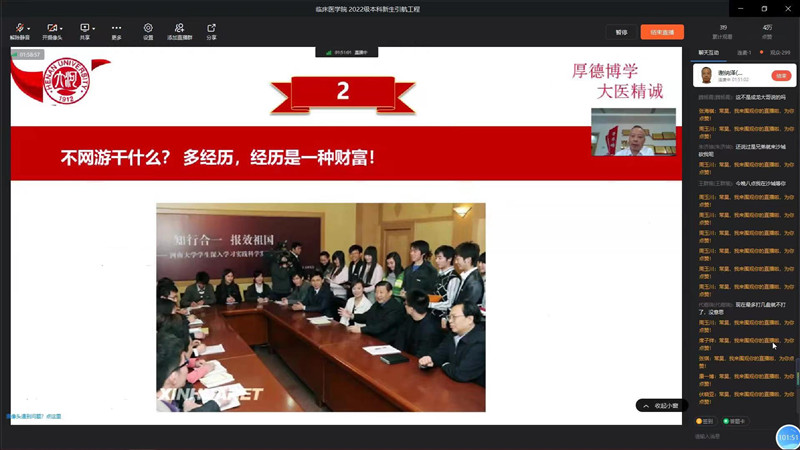 随着2022级新生报到加入,临床医学院现有本科生1613人,研究生1085人。此次分享会是临床医学院2022级本科新生引航工程系列活动的一部分。根据学生处、研究生院有关要求,近期,临床医学院将邀请有关专家、校友,对2022级新生开展爱党爱国教育、专业思想教育、心理健康教育、民族团结和宗教政策教育、考研启蒙教育等,引导新生尽早适应大学生活,主动规划学业,全面成长成才。