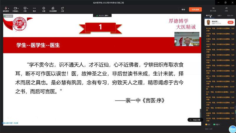 9月3日上午,临床医学院2022级本科新生引航工程首场报告会举行,临床医学院党委书记谢纳泽通过钉钉会议平台,以“我对大学的理解和对大家的期待”为题,给学院全体2022级本科新生做分享交流。分享会由2022级本科生辅导员常昊主持。