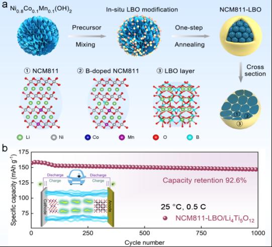 锂离子电池高镍三元(NCM)正极材料由于高的比能量而备受关注。然而,在循环过程中,严重的氧析出不可避免地造成了热安全问题,另外材料剧烈的体积变化引起了应力的产生和积聚,导致高镍材料二次颗粒沿晶界处产生裂纹,进而诱发电解液的渗入并与内部晶格发生副反应,最终致使电池循环性能快速衰退。白莹教授课题组采用简单的原位构筑方案,将与氧具有高结合能的硼离子梯度掺杂进入高镍材料一次颗粒晶格中,并在二次颗粒表面构筑具有压电特性的四硼酸锂包覆层,将内部NCM的应力原位转化为周期性变化的界面局域电场,协同参与调控电极-电解质界面处Li+的输运行为。该研究还采用多尺度的原位/非原位实验表征结合理论计算以及有限元分析证实了这种原位构筑的氧释放缓冲层和界面离子输运调控层可以有效提升高镍正极材料的结构稳定性和电化学性能。该工作为提升锂离子电池热安全性能和改善固液界面性能提供了新的研究思路和技术手段。